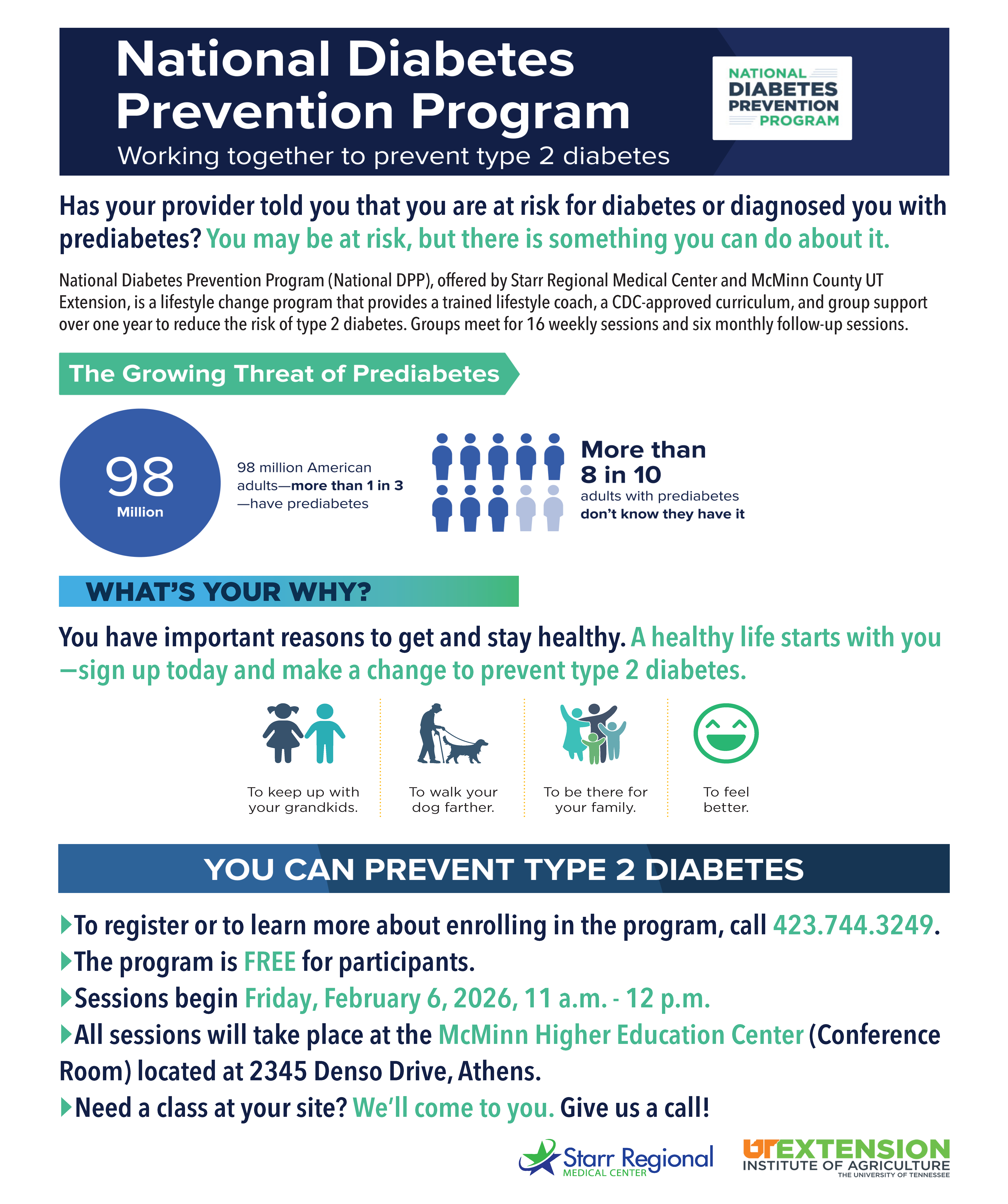 Starr Regional Medical Center and the McMinn County UT Extension Office are offering the free National Diabetes Prevention Program (DPP) to help community members prevent type 2 diabetes together. Guided by trained professionals, participants learn the skills they need to make lasting changes such as losing a modest amount of weight, being more physically active and managing stress in a group setting. Program sessions will take place at the McMinn Higher Education Center’s Conference Room, located at 2345 Denso Drive, Athens, beginning Friday, February 6, from 11 a.m. – 12 p.m.